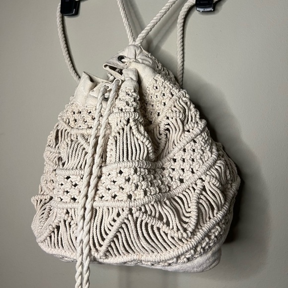 Macrame backpack with canvas bottom. Tie pull closure with fringe. Beige color. Great for use as a beach bag. No flaws.