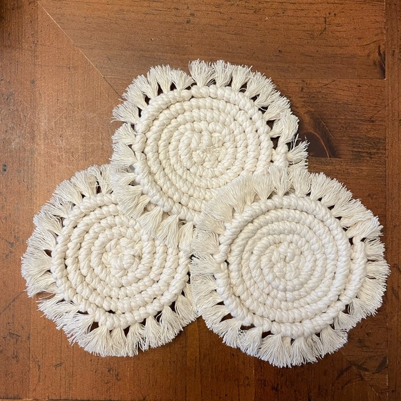 Handmade macrame coasters in a cream color made with fixed fiber material. Each is approximately 6 inches in diameter. Set of 3. New
