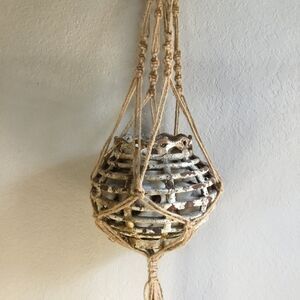 Macrame plant holder (please note planter is not included). Macrame holder is 40” made from natural twine. Light creamy brown. Twisted design at top. Excellent condition.