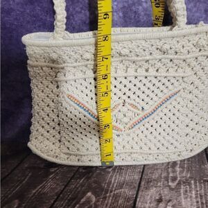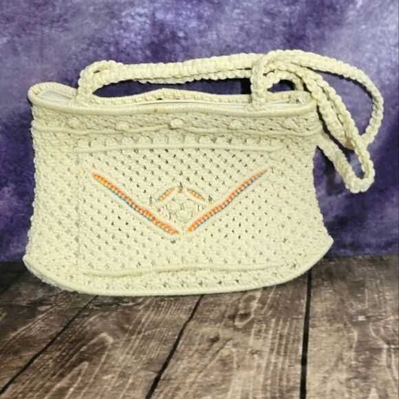 Beautiful Vintage Macrame Handbag with orange stitching on the front pocket. Measures 8 inches high, 11 1/2 inches wide, drop is about 10 1/2 inches.