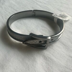 Stylish bracelet featuring a silver glitter design with belt buckle accents. Perfect for adding sparkle to any outfit.