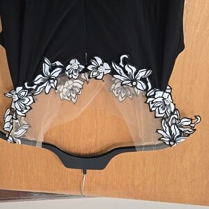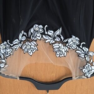 This is a beautiful long gown. very soft. rushing on the front. white embroidered flowers around the neck. with rhinestones and pearls. Full zipper in the back for easy access. And the front has 2 cups.