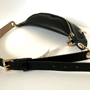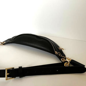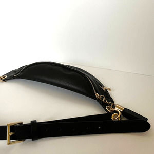 @swaggalicious13 Hi! Great questions! I’m sorry the Fanny pack is not leather. The Fanny pack by itself or from side to side is 12.5 inches. The whole Fanny pack including belt, measures at 42 inches. I apologize, I noticed I did not add size. The Fanny pack is a size Medium. Hope this was of help!❤️