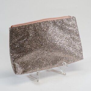 -Interior bag is pink metallic on one side and pink glitter on the other with a zipper closure.
