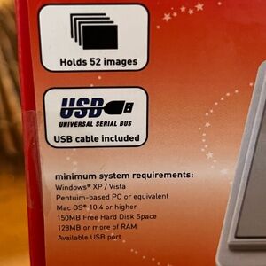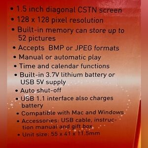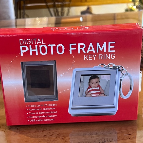 Digital photo frame key ring in red. Holds up to 52 images with automatic slideshow. Features time and date functions. Includes rechargeable battery and USB cable.
