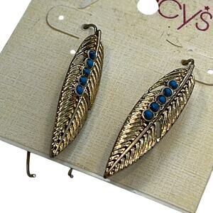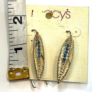 Macy’s Gold Feather Dangle Earrings w/ Blue Stone Accents, NWT!