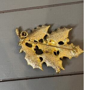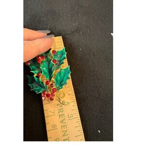 Add a touch of festive sparkle to your outfit with this beautiful Macy's Holiday Lane brooch! Featuring a classic holly and berries design with gold-tone accents and sparkling rhinestones, this brooch is the perfect accessory for the holiday season. It's in great condition and ready to wear or gift.