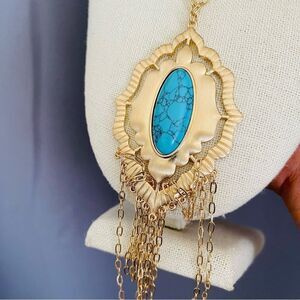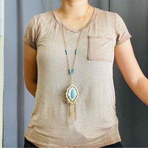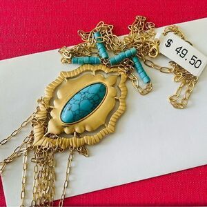 New with tags Long necklace Gold tone with faux turquoise Length 34”