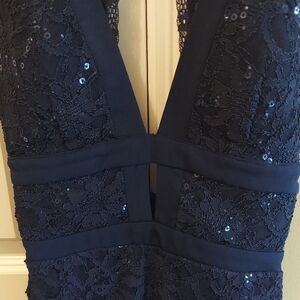 Stunning navy dress with sequins. Backless design for a chic look. Perfect for evening events.