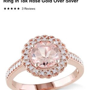 Macy's Morganite (1-1/6 ct. t.w.) and Diamond (1/8 ct. t.w.) Floral Halo Ring in 18k Rose Gold Over Silver. This ring features a beautiful round-cut Morganite stone surrounded by a halo of sparkling diamonds, with additional diamonds set along the sides of the band. I love this ring, but I only wore it once. It should be worn by someone who will wear it frequently. It isn't easy to get a good picture with the lighting. The Macy's pics look more like the ring.