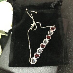 Add sparkle to any outfit with this Macy’s sterling silver-tone bolo bracelet, featuring alternating red ruby-colored heart stones and clear cubic zirconia crystals. Adjustable, elegant, and perfect for gifting!