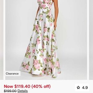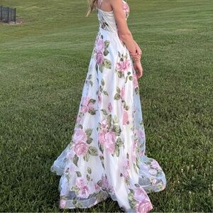 This elegant gown features a strapless neckline and a sleeveless design, perfect for a wedding guest or cocktail event. The dress showcases a beautiful white base adorned with pink floral patterns and green accents, creating a fresh and romantic look. Its flowing maxi length and fitted waist offer a graceful silhouette, ideal for making a statement at any special occasion.