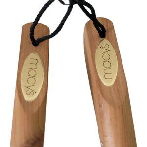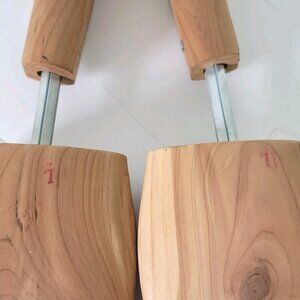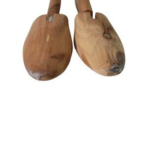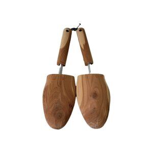 The Macy's Wooden Shoe Stretchers are specially designed to help shape and stretch shoes, maintaining their quality and fit. Made of high-quality wood, these shoe stretchers are durable and effective in preserving the shape of your footwear. With the trusted Macy's brand name, you can rely on these shoe stretchers to keep your shoes looking and feeling great for longer. They are marked as size large with a red 'L' stamp on their bottoms. Some discoloration at toes, as pictured.