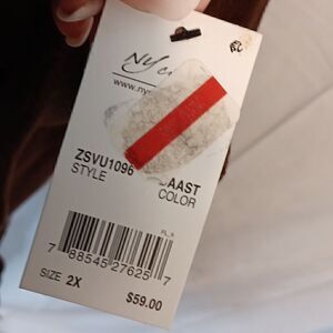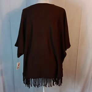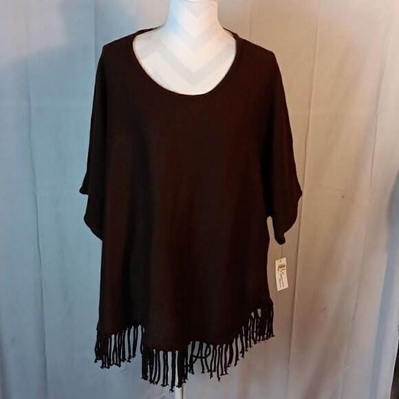 This New with tags brown knit short sleeve Macy's New York Collection fringed sweater is a size 2X with a pit to pit measuring 26" and a length of 28". All offers are welcome.