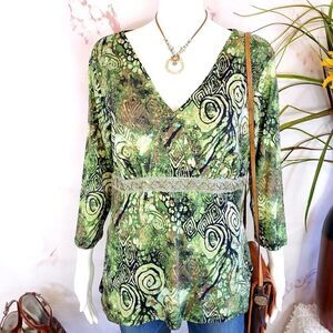 Excellent condition no flaws Macy's pullover v neck print top fully lined embellished embroidery waist