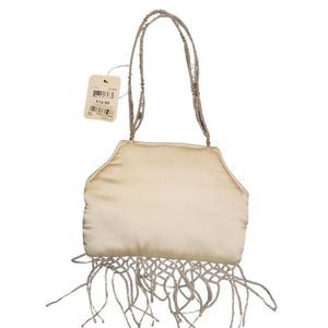 This vintage look purse in ivory color is perfect to add a Boho touch to your outfit. The beaded straps give it a unique touch while the magnetic snap button closure ensures the safety of your belongings. The fabric outer is soft and durable, and the fabric lining keeps your items protected. This purse also comes with interior pockets to help you stay organized. The webbed beaded fringe detail adds a chic element to the overall design.