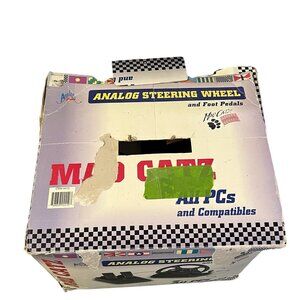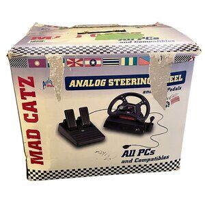 The Mad Catz Analog Steering Wheel and Pedals is a wired controller designed for racing PC games. It features a sleek black design, plastic construction, and is compatible with various game titles, consoles, and controllers. This steering wheel and pedals set is perfect for single-player gaming and offers a realistic racing experience with its analog controls and responsive design. The included box provides convenient storage and transportation for the unit, making it a must-have accessory for racing game enthusiasts.
