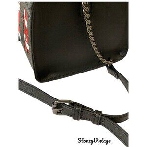 The bag is made of faux leather and lined with polyester, with inner pockets for added organization. The black and silver color scheme and silver hardware add a touch of elegance to the bag.