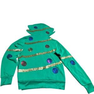 Get ready to spread some holiday cheer with this Mad Engine Extreme Christmas Tree hoodie! This eye-catching hoodie features a fun and festive Christmas tree design, complete with colorful balls, shimmering gold metallic ribbons, and dazzling sequined ornaments. New with tags and in excellent condition.