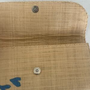 The Mad Imports Clutch Handmade Madagascar Woven Straw Brown Bird Blue Leaf Design is a small, lightweight clutch purse perfect for casual occasions. Made with hand-woven straw in a brown exterior color with blue leaf and bird design, this clutch features a magnetic closure, lined interior, and stainless steel hardware accents. With no strap or handle, this modern and bohemian piece is ideal for summer and adds a touch of elevate casual style to any outfit. Made by the brand Mad Imports in Madagascar, this unique accessory is a must-have for those who appreciate handmade craftsmanship and eye-catching details.