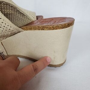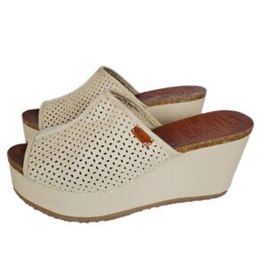 Mad Love sz 11 platform wedge canvas slide sandal. Lazer cut diamond design. Great condition, has a small dent on the inside right shoe and a mark and the left shoe has the very slightest crinkle at the toe. Please see all pictures