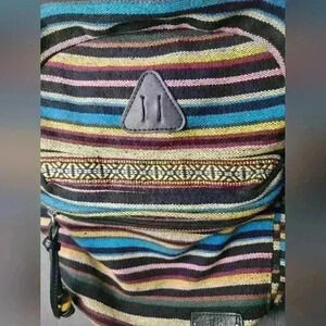 Mad Love tribal Aztec print backpack festivals. 14" tall, 13" wide, 4.5" deep. Gently used. The only flaw is missing a zipper in the main compartment, as shown in the picture. item #39-B