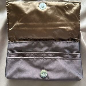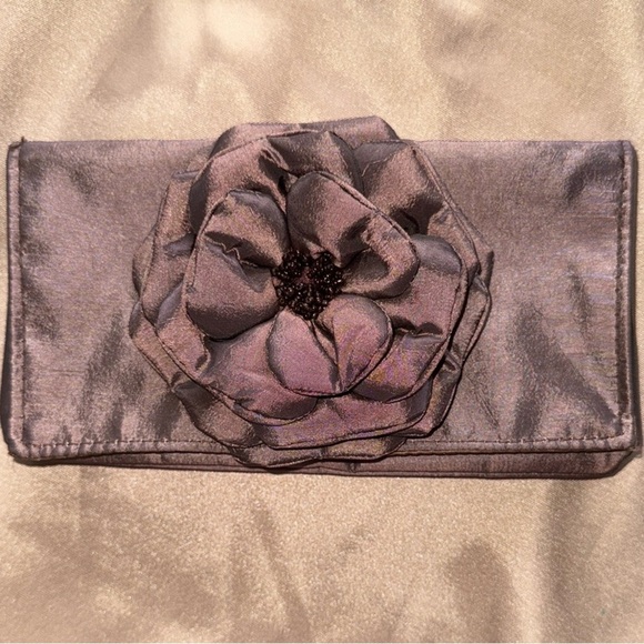 Mad By Design iridescent shimmery brown wallet or clutch in excellent condition. Pristine interior. 3-D flower with horn beads in the middle is on the front. Snaps close. Inside are credit card/license slots, bill holder and a small zippered compartment.