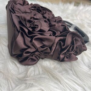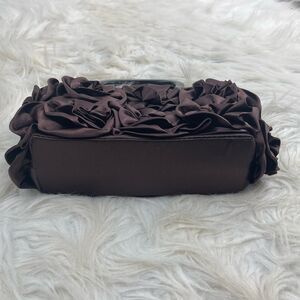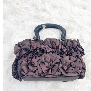 Mad by Design handmade flower purse. Handspun silk and natural horn. Brown floral shell with brown lining. Magnetic top closure and interior zipper pocket. Shiny black dual hard handles. Minimal to no issues.