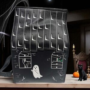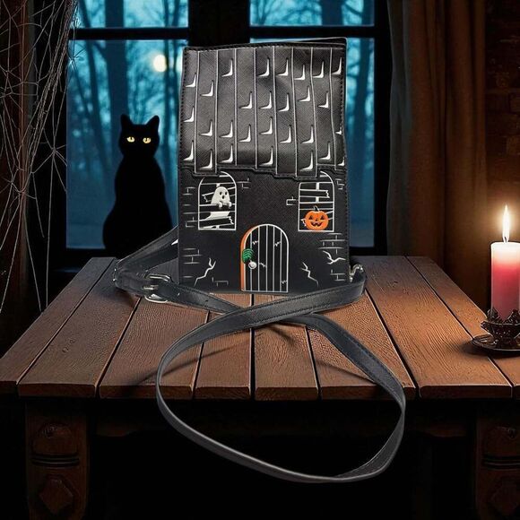 Spooky and stylish Mad Engine Haunted House Halloween Crossbody Purse, perfect for adding a touch of fright to your outfit. This unique crossbody bag features a haunted house design with playful details like a ghost and a pumpkin, making it ideal for Halloween events or year-round wear for horror enthusiasts. The bag is made from durable black faux leather with a textured roof design and small windows. It includes a detachable shoulder strap, allowing it to be used as a crossbody or a clutch. The interior is lined with black fabric and has a small zipper pocket for essentials. Excellent pre-owned condition, no visible flaws.