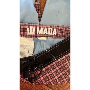 Stylish Mada board shorts in pink and blue, perfect for beach outings or resort wear. Comfortable fit for a size 30, offering a vibrant coastal vibe. Elevate your summer wardrobe with these eye-catching shorts designed for leisure and relaxation.