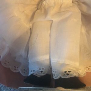 Cotton white pantaloons with similar trim as underskirt.