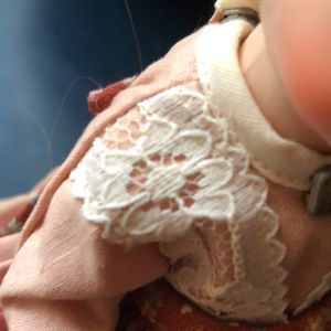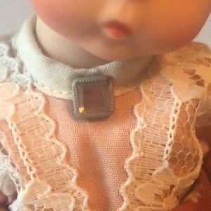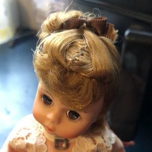Back of the dress is discolored, maybe from being stored in the box? It’s not noticeable when displayed in a cupboard. The rest of the doll is in great shape. See the pictures and judge.