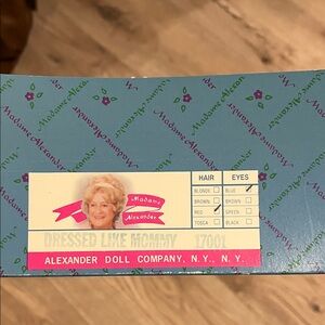 Charming Madame Alexander doll. Features a pink hat with a white flower. Wears a yellow dress with blue lace. Includes pink shoes and pearl necklace.