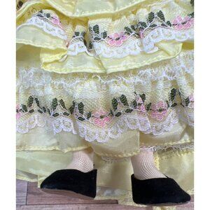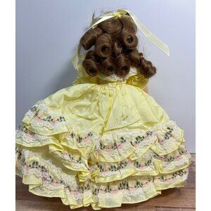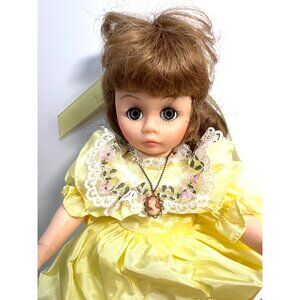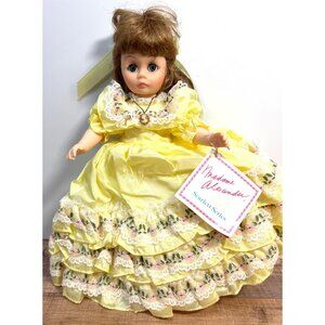 This Madame Alexander doll showcases intricate detailing with a yellow lace dress and delicate embroidery, making it a charming collectible.