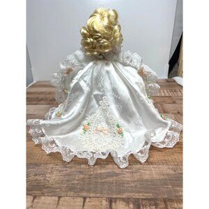 This limited edition Madame Alexander doll showcases intricate lace detailing and a satin wedding gown. Includes a bouquet, COA, and original box.