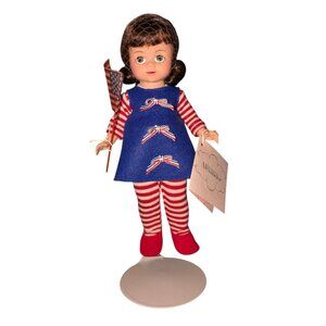 This doll's got more spirit than a cheerleader on caffeine! Decked out in patriotic style, Maggie's ready to rally the troops with her flag, and that hat is a fashion statement all its own. A collector's item that's as American as apple pie and twice as cute.