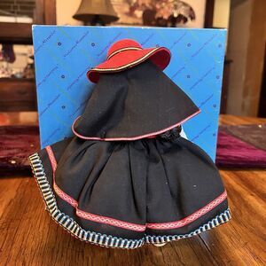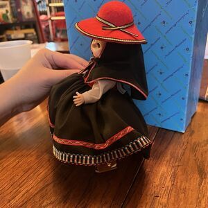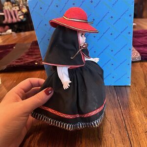 This Madame Alexander doll from the 1980s is a vintage collectible featuring a Peruvian character with dark brown curly hair. The 8-inch fashion doll comes in her original box and is part of the Dolls of the World product line from Peru. This particular doll is a single unit and is made of cloth, making it a unique addition to any doll collection for all occasions.