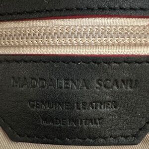 Maddalena Scanu Black Genuine Leather Bag Made in Italy. Slouch/Hobo leather bag, made in Italy, from Maddalena Scanu. Black with silver tone hardware and red leather trim on the top edge. There are condition issues with the bag. Four feet on the bottom. The silver coating has rubbed off and they appear copper in color. Top zip opening that is lower than the top of the bag. Magnetic snap closure in addition to the zipper. The zipper tail extends 3 1/2" past the edge of the bag. It can be folded across the zipper and hidden below the top edge. There is cracking along the red trim. The interior has a side zipper pocket and a slip pocket opposite. It has ink stains on the bottom and sides of the lining. The handle shown in the picture is removable and the bag came with a short handle; however, one end of the short handle is missing a clip (see last 2 pics.) The exterior leather is both smooth and pebbled. It is in excellent condition with no signs of wear.