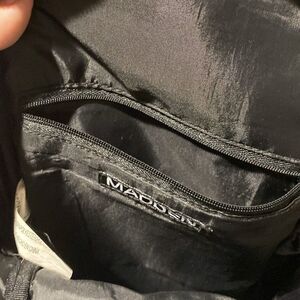 Three zippered areas and an additional inside GUC, some iridescent coloring inside, adjustable straps, has a hanging loop, loops on both side to change direction, great for travel, sports, keeps both hands available