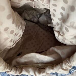 Madden Girl backpack, chambray patterned denim look outside, tan polka dot lining. Inside it has 1 zip up and two other pockets. Drawstring closure, magnetic 'buckle' flap. Excellent condition, NWOT Body: 100% Cotton Lining: 100% Polyester, vegan leather trim. Could be used as an women's bag as well. WIDTH (EAST TO WEST, across top) 14" HEIGHT (NORTH TO SOUTH) 15" DEPTH (across bottom) 5" STRAP DROP 3"
