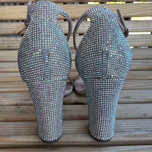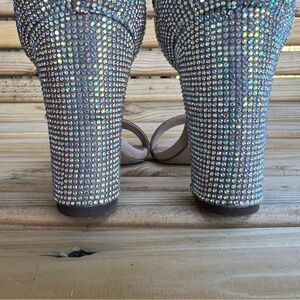 • Allover rhinestone accent upper and a chunky block heel