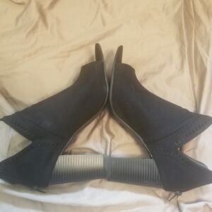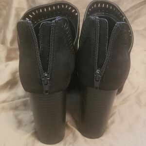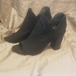 Madden Girl Black Open Toe Booties. Size 9.5. Approx 4" Block Heel. Zip Up Back. Suede like material. Marks as shown in pictures I didnt try to clean.