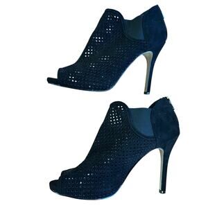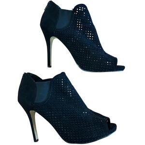 Pre-owned Madden Girl perforated black faux leather booties featuring a peep toe and back zipper closure. The upper has small perforated holes for a breathable, stylish look. These high heel booties are modern and edgy, with no platform and a slim, stiletto-style heel. Light wear on the insole and outsole as shown in photos, but still in good condition with plenty of life left.