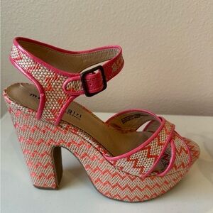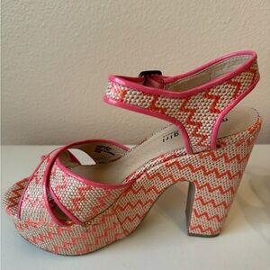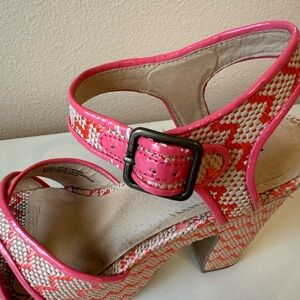 Make a statement with these eye-catching Madden Girl platform sandals! The woven platform and block heel feature a vibrant zig-zag pattern in shades of orange and beige, perfectly complemented by glossy bright pink trim and straps. The criss-cross straps across the toes and the adjustable ankle strap with a silver-tone buckle ensure a secure and stylish fit. These fun and flirty sandals are perfect for adding a pop of color and a touch of height to any spring or summer outfit.