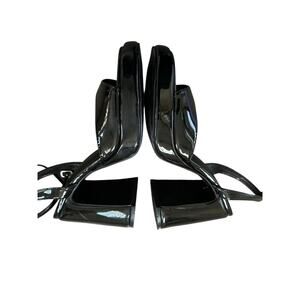 madden girl caicos, black patent heels, platform heeled sandals, block heel sandals, ankle strap heels, y2k party heels, clubbing shoes, night out shoes, formal heels, women’s size 8 heels, glossy black sandals, statement heels