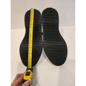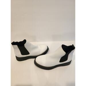 Madden Girl Chelsea boots in crisp white faux leather with black elastic panels and a 1.5” platform lug sole. Pre-owned in excellent condition. Size and material tags are missing, but measurements are included for fit reference: