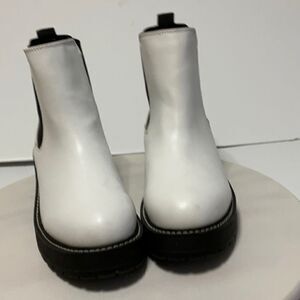 Madden Girl Chelsea Boots, Cindy, 8.5. White upper with black stretch panels. Pull on. Thick black nonslip rubber soles. Platform 1”, heel 2” very faint marks on toes, probably will disappear with polish. So cool. #y2k #whimsy #chelseaboot