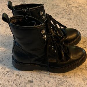 These boots feature a classic combat boot silhouette with a lace-up front and a side zipper closure for easy wear. They typically come with a chunky lug sole and are crafted from synthetic materials
