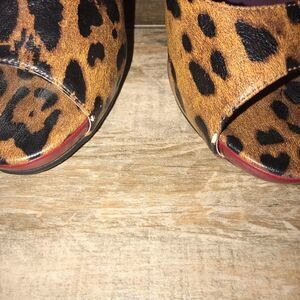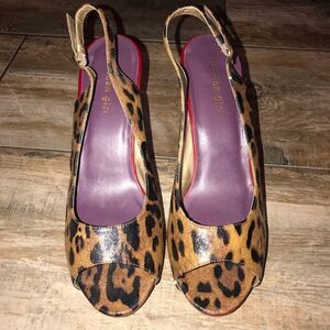Cute, but not perfect, peep-toe slingbacks from Madden Girl. Faux leather leopard print with red trim in a size 10. There is a spot near each of the toes that shows some wear and another knick near the buckle on the left shoe. Like I said, not perfect, but these have tons of wear left! Very cute!