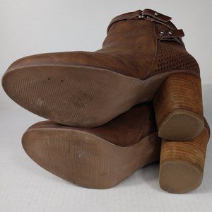 Used in good condition. This bootie is ideal accent to jeans or dresses and features modern laser cut detailing at the heel and harness. Rounded toe, 3 1/4 stacked block heel. Polyurethane upper and man-made sole.